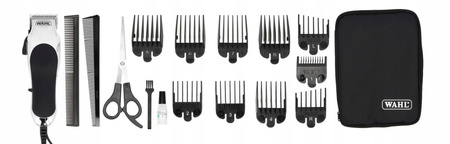 - Grzebienie: W zestawie 8 nasadek grzebieniowych, stożkowe nasadki do lewego i prawego ucha, nożyczki, grzebień do stylizacji, futerał, olej do ostrzy