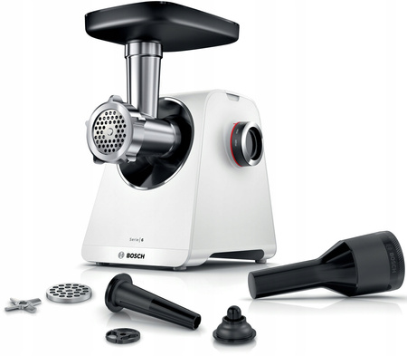 Biała obudowa z elementami metalowymi nadaje maszynce Bosch Serie 6 MFWS607W nowoczesny wygląd, łącząc trwałość z łatwością czyszczenia.