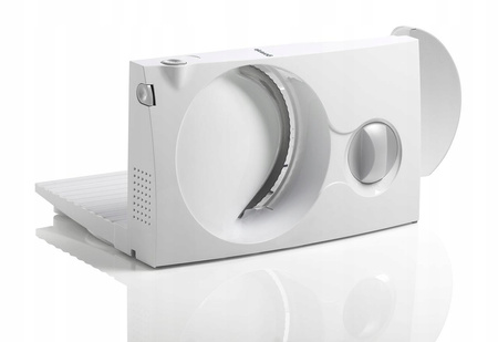 Model R401W to praktyczna krajalnica wykonana z materiałów wolnych od BPA, wyposażona w ostrze Solingen ze stali nierdzewnej oraz zabezpieczenie przed przypadkowym uruchomieniem.