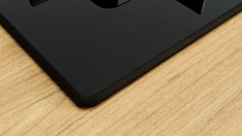 Czarna powierzchnia szklana nadaje kuchni elegancki, minimalistyczny charakter.