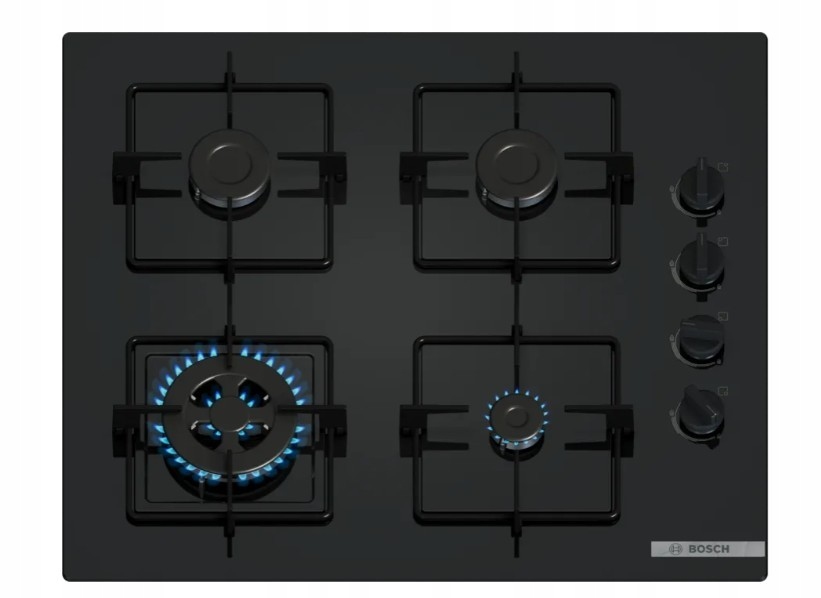 Płyta gazowo‑szklana Bosch z lekkimi rusztami stalowymi, szerokim rozstawem pokręteł, palnikiem WOK oraz pełnym zestawem zabezpieczeń. Idealna do codziennego gotowania i nowoczesnych kuchni.