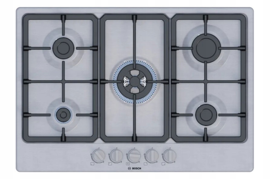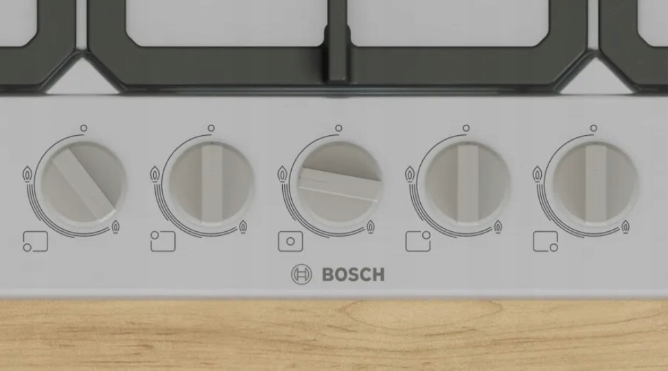 Płyta gazowa Bosch z 5 palnikami, stabilnymi rusztami żeliwnymi, funkcją odcięcia gazu oraz palnikiem WOK do intensywnego gotowania.