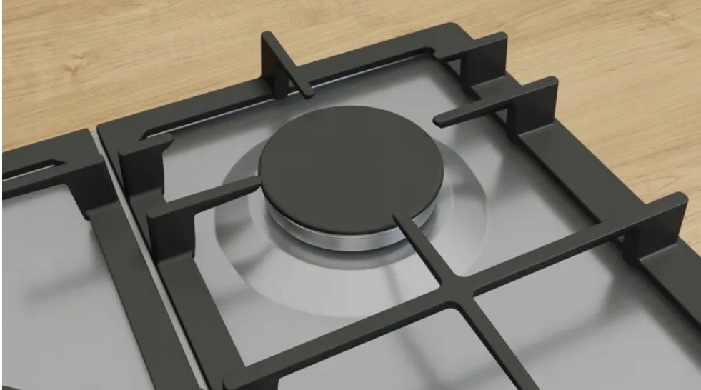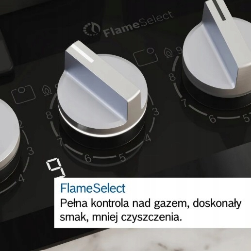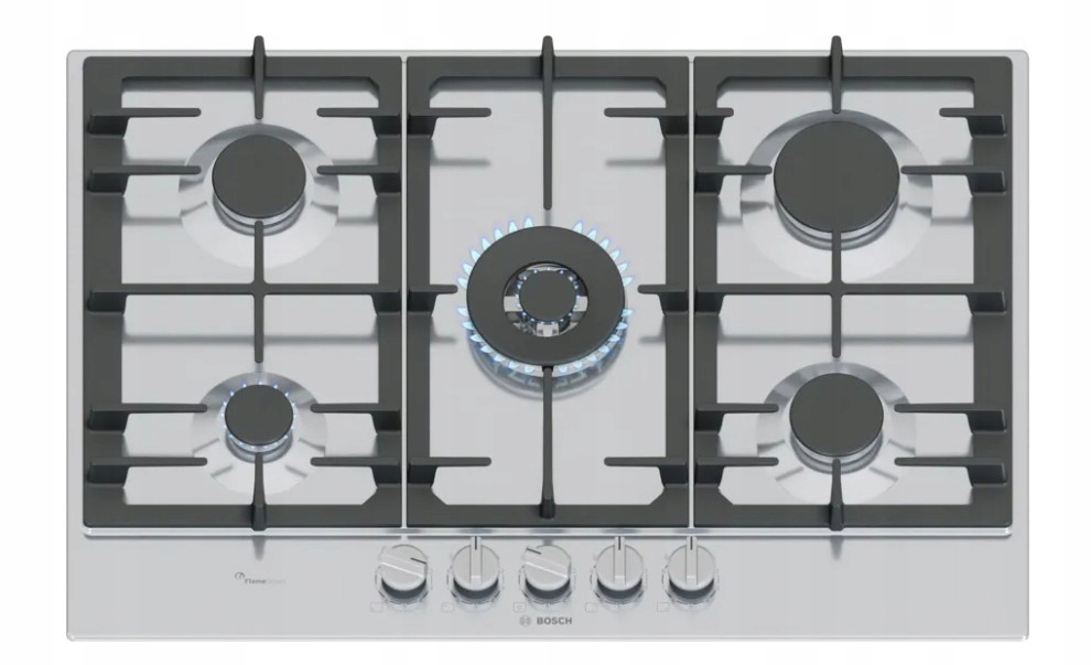 Wysokiej klasy płyta gazowa Bosch w kolorze inox, wyposażona w 5 palników, funkcję FlameSelect, żeliwne ruszty oraz wygodne sterowanie pokrętłami.